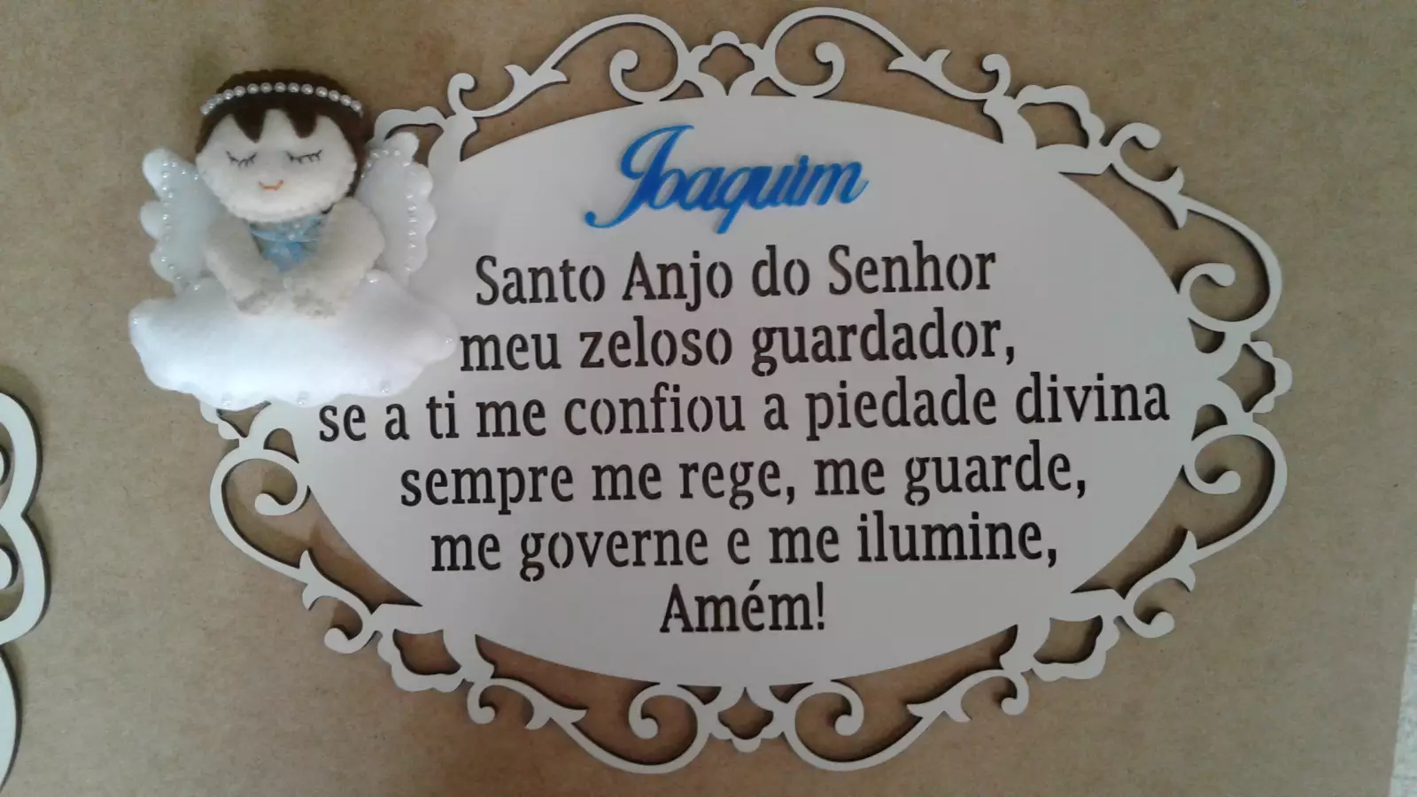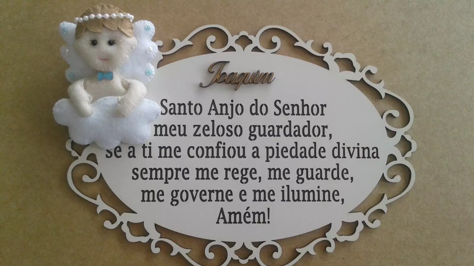 Linda placa em MDF branco 3mm com corte e gravação a laser Placa com oração do Santo anjo e anjinho em feltro